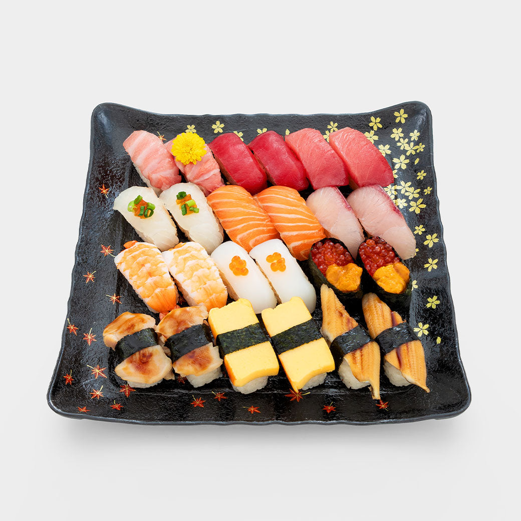 おおよそ4〜5人分の分量になります。大トロ、中トロ、赤身、タイ、サーモン、カンパチ、エビ、イカ、ウニイクラ軍艦、煮ハマグリ、玉子、穴子